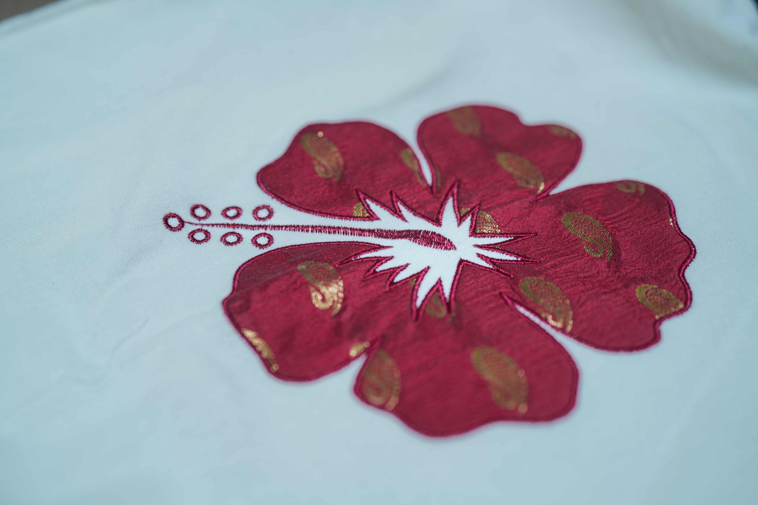 At the center of the design is a stunning red hibiscus motif, symbolizing beauty, warmth, and vibrancy. This bold floral element is further enhanced by intricate gold paisley detailing, adding a touch of richness and traditional charm. The combination of red and gold embroidery gives the cushion a festive, luxurious, and culturally inspired appeal.